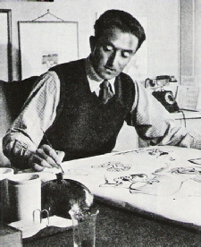 Trier provided the front cover design for every issue of Lilliput from its start until 1949. Each time the design employed a man, a woman, and a dog. The couple, Frau Lena and Herr Walter, and their Scottish terrier dog were reinvented for each new issue. They were drawn in different places and ages, as different ethnicities . It seems the terrier was based on Trier's own dogs Zottel and Maggy who he immortalised in his Lilliput covers